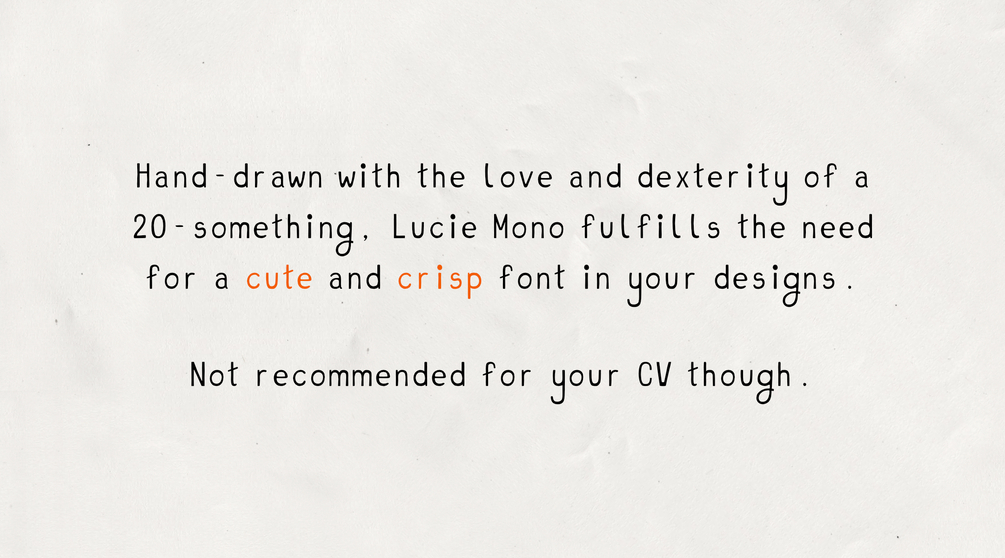 Hand-drawn with the love and dexterity of a 20-something, Lucie Mono fulfills the need for a cute and crisp font in your designs.